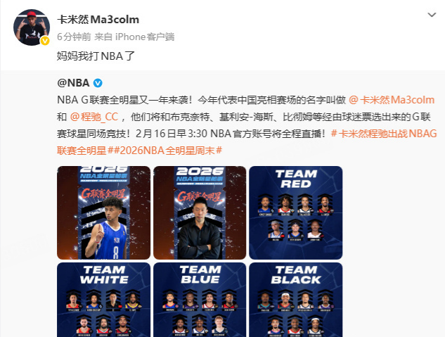 北京时间2月7日,NBA官宣NBA2026年发展联盟全明星周末的G League Next Up Game赛事阵容,有两位中国球员入选,分别是来自CBA宁波男篮的卡米然,以及程驰,卡米然还发文感慨“妈妈我打NBA了。”